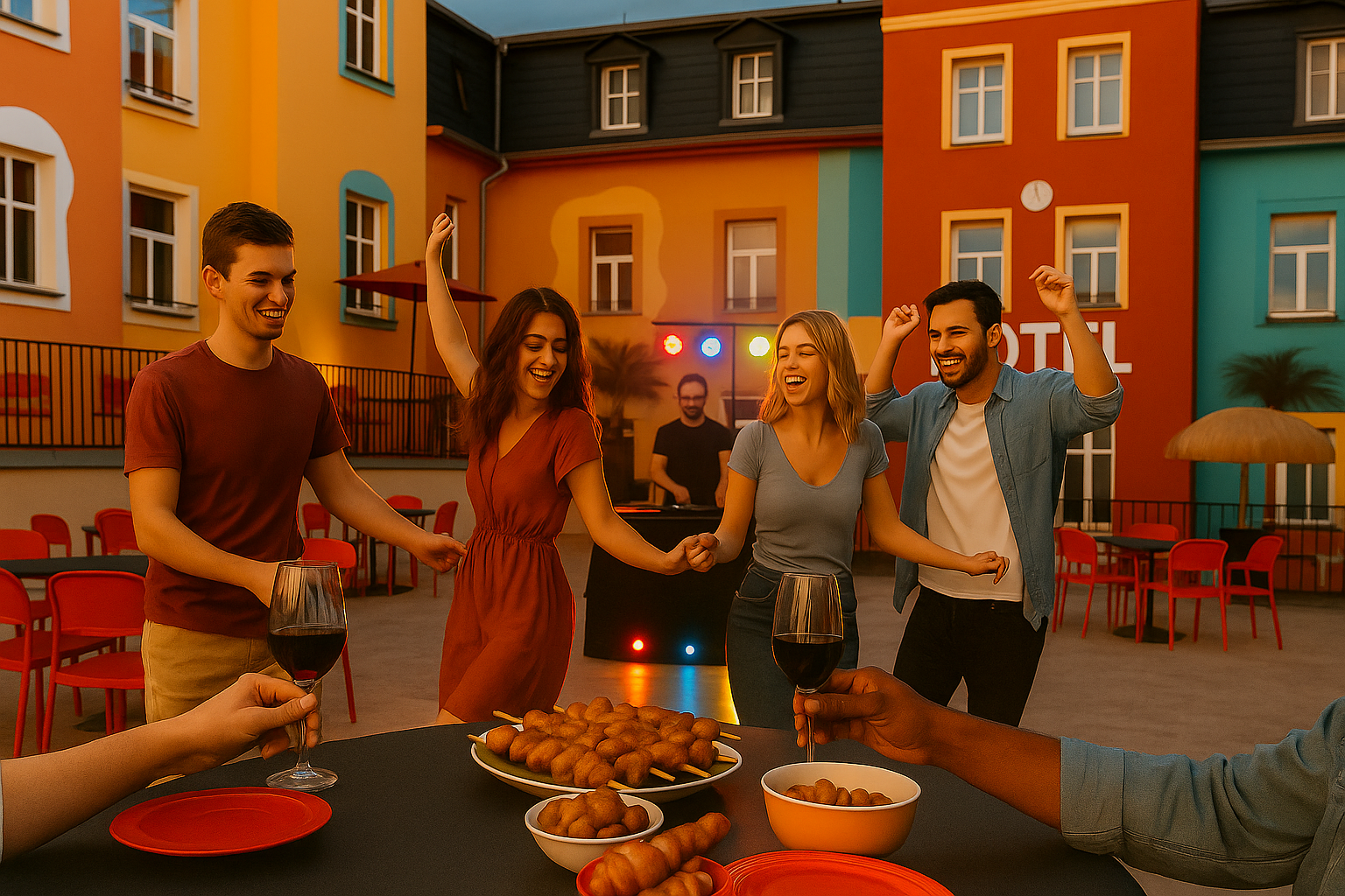Erleben Sie lustiges Self-Cooking am Tapas-Grill – gesellig, unterhaltsam und absolut einzigartig. Dazu sorgen fetzige Ton- & Lichteffekte „All you can beat“ für echtes Rooftop-Feeling. An unserer Bar erwarten Sie sommerliche Highlights wie Sangria, Bowlen & kreative Cocktails, während bequeme Sitzmöbel und Loungemusik den Abend abrunden.